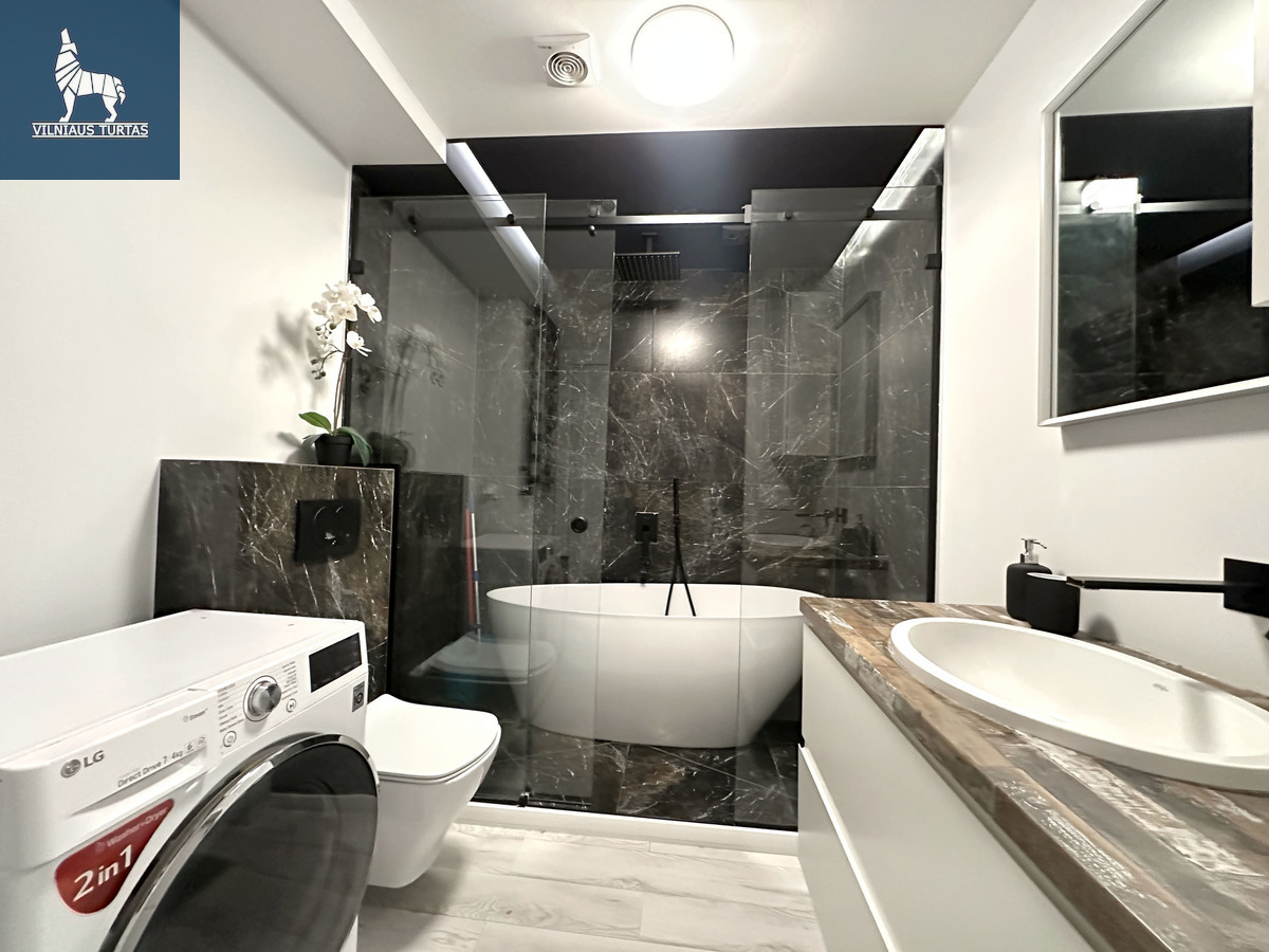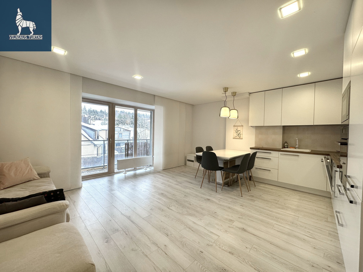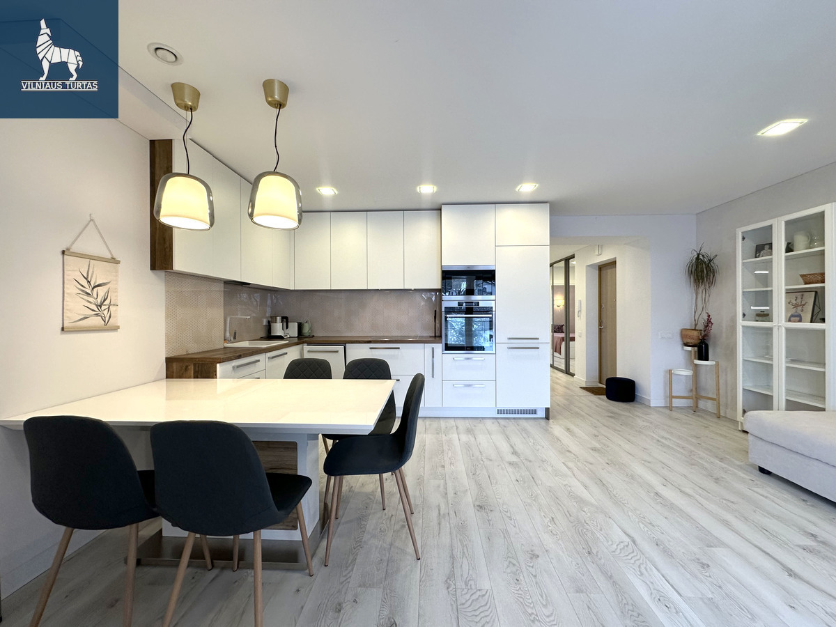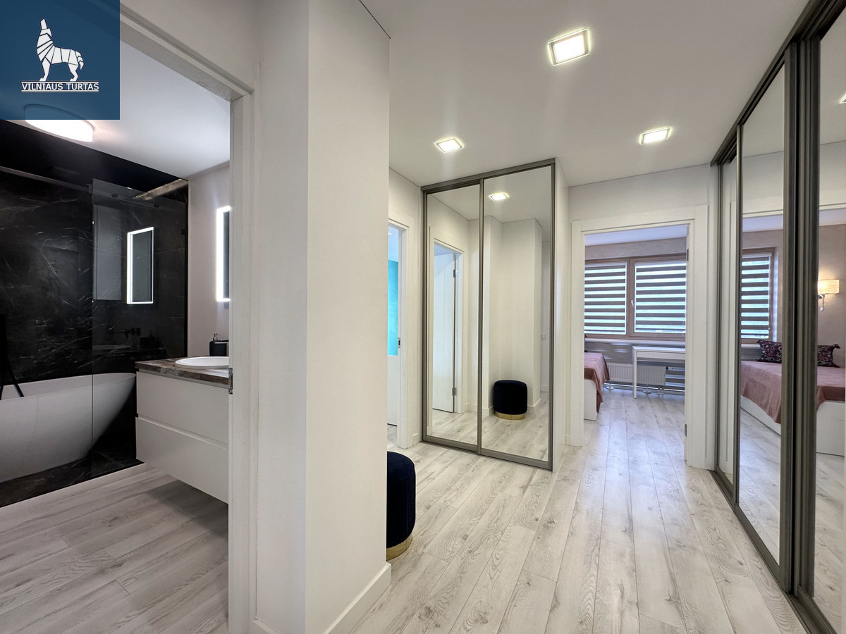 5 aukštas iš 7, bendras plota 69 kv.m., statyba 2021 m., mūrinis namas, didelis balkonas-lodžija, vonia ir tualetas kartu, du izoliuoti kambariai, svetainė kartu su virtuvė, bute didelės ir gerai apgalvotos spintos, daug apšvietimo, geros lovos su patogiais čiužiniais.