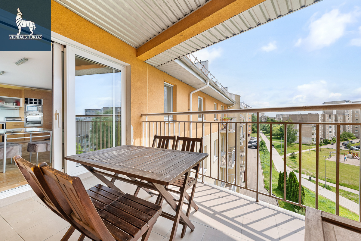 • Didelis balkonas kaip terasa, į pietinę pusę – puikiai tinka augalams, rytinei kavai ar vakaro poilsiui su knyga.