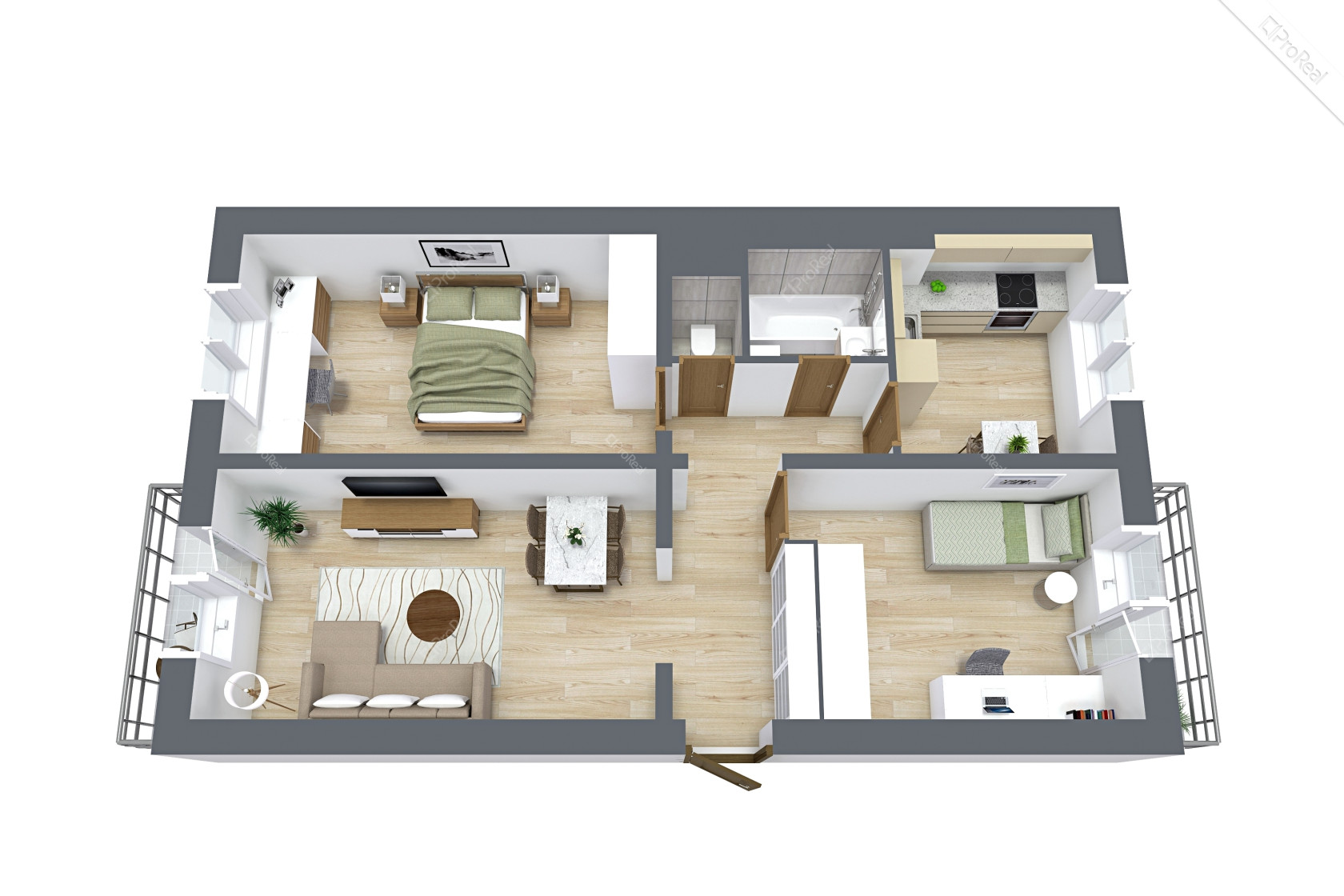– 3 atskiri kambariai, erdvi virtuvė.